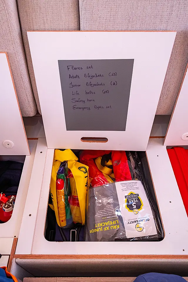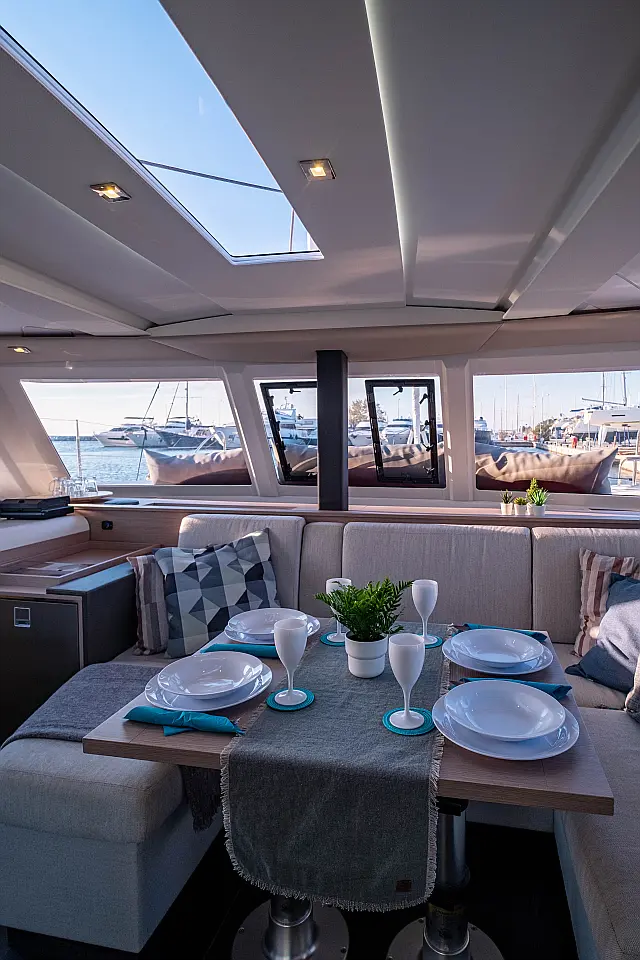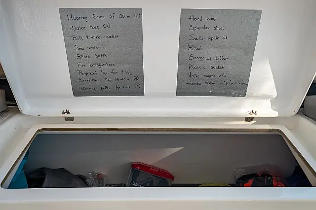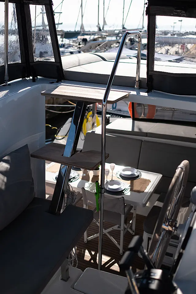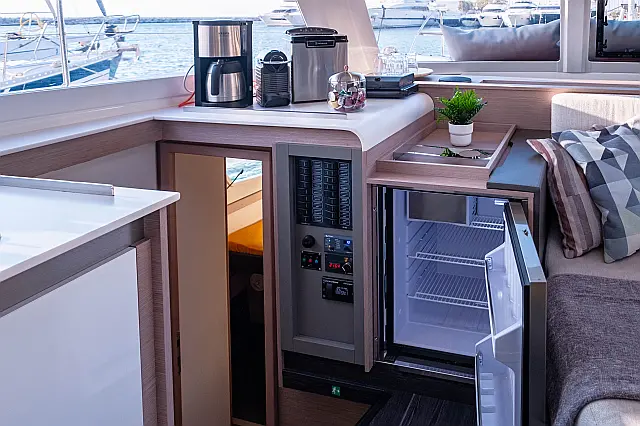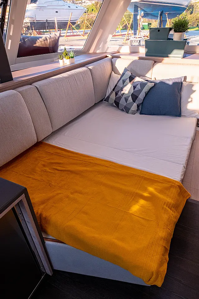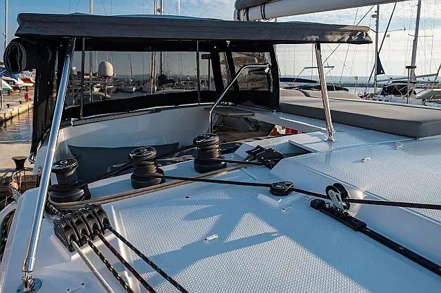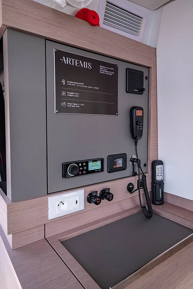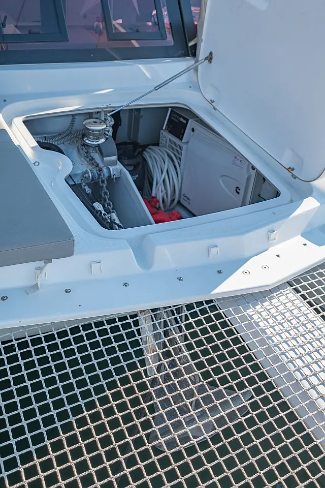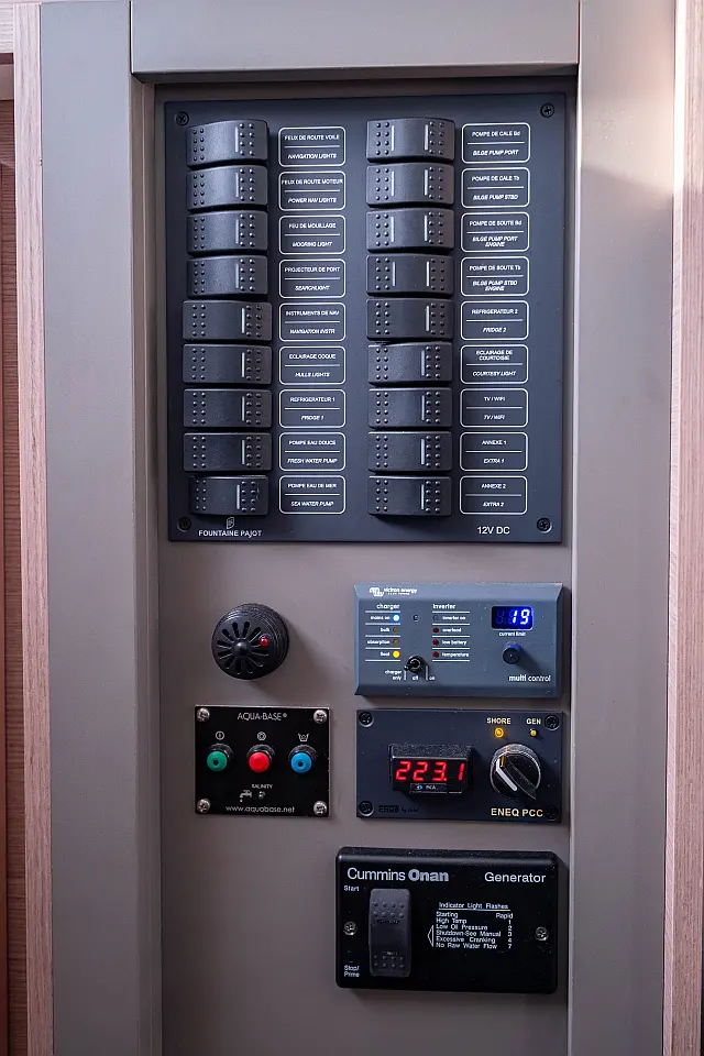 Refrigerator , Cockpit speakers , Electric winches , Dinghy , Air condition , Generator , Inverter , Electric toilet , Solar Panels , Water maker , Outboard engine , Cockpit cushions , Teak Cockpit
