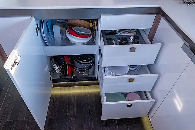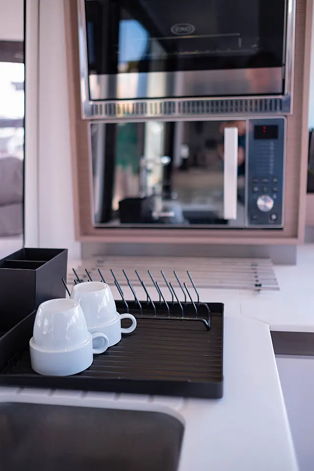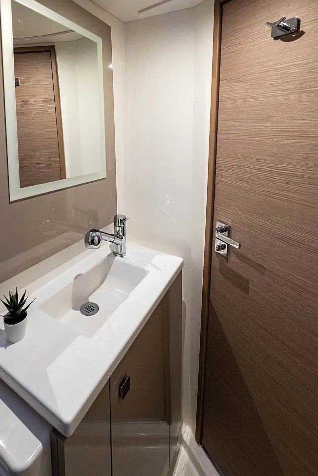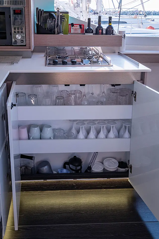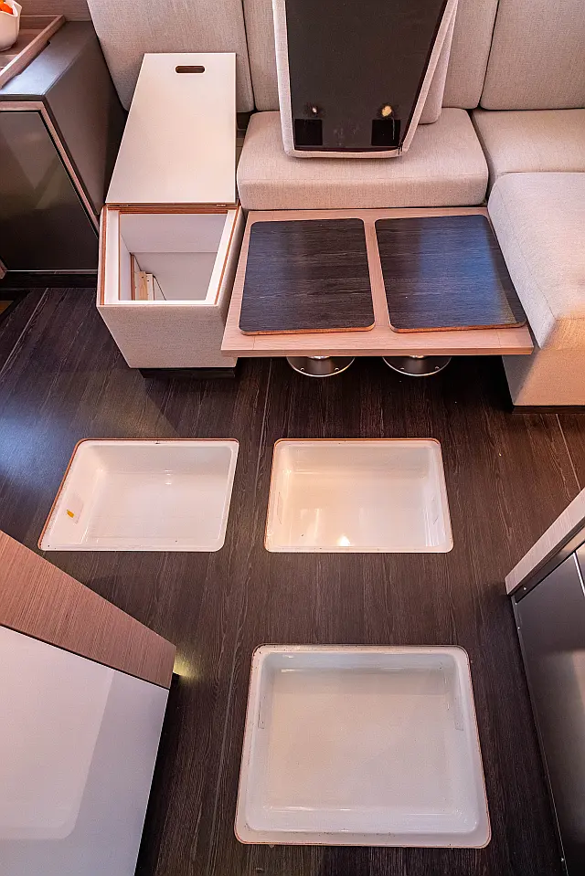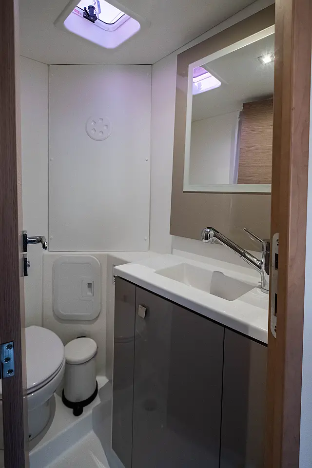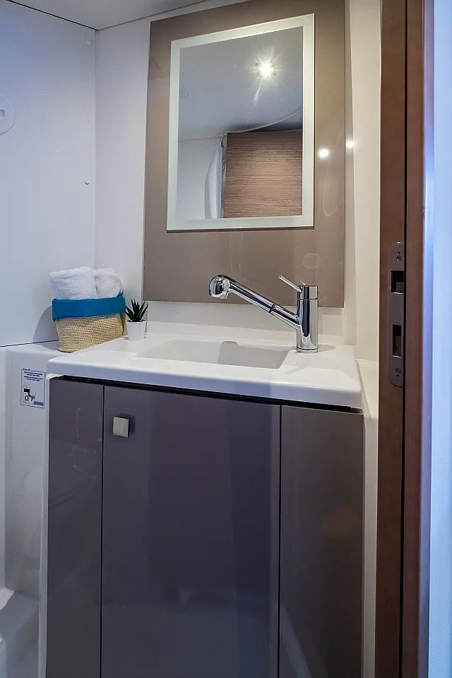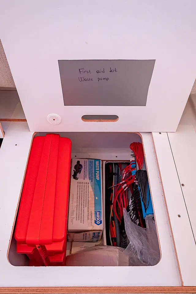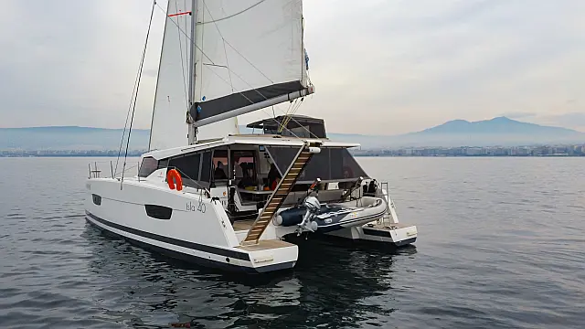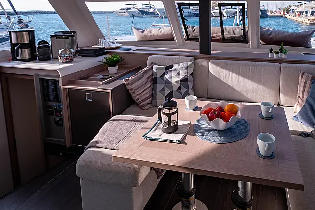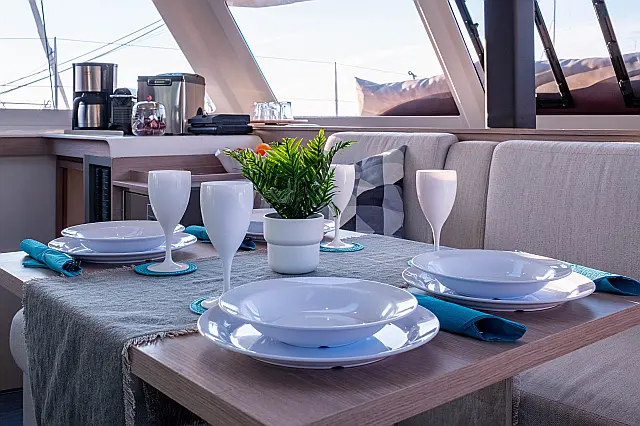 Refrigerator , Cockpit speakers , Electric winches , Dinghy , Air condition , Generator , Inverter , Electric toilet , Solar Panels , Water maker , Outboard engine , Cockpit cushions , Teak Cockpit