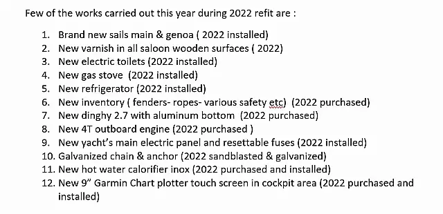 Dinghy , Electric toilet , Solar Panels , Inverter , Teak Cockpit , Teak deck